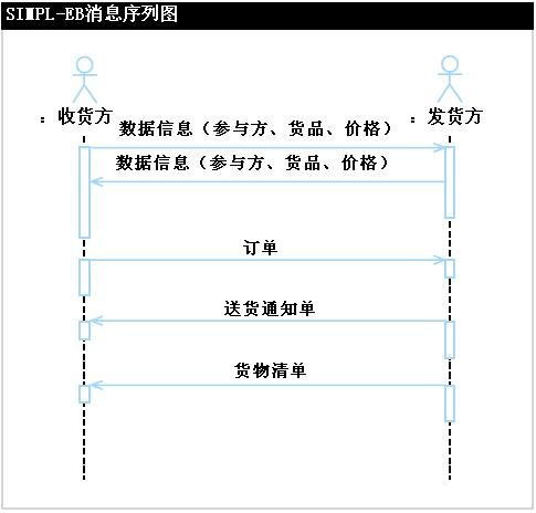 UCC通過為買賣雙方之間的交易設(shè)計(jì)一個(gè)基本框架來為交易建模,他們稱此交易為Simpl-eb。核心的消息序列為:交易方信息、交易請求、價(jià)格、地點(diǎn)和訂單、發(fā)貨通知單(DA)以及發(fā)貨清單。前兩條消息為一組;最后的三條消息在交易中為一組,其中發(fā)貨通知單排第二位。發(fā)貨通知單告訴我們貨物的詳細(xì)信息以及發(fā)貨的日期,因此在發(fā)送通知之前要保存發(fā)貨通知單。圖1所示為UML序列圖,該圖匯集了上述所有的信息。